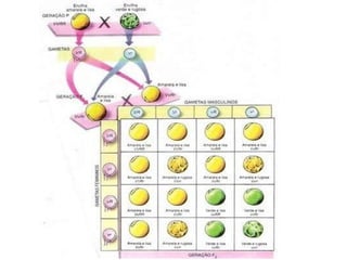75% amarela e25 % verdes Se plantas híbridas (heterozigotas) amarelas forem cruzadas com outras amarelas heterozigotas sua descendência terá a proporção de 3 amarelas para 1 verde: ♂ /♀ V V V VV Vv v Vv Vv