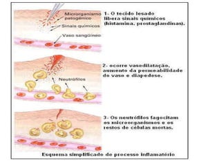 Funções do sistemaimunológico: Combater antígenos (qualquer molécula, célula ou microrganismo estranho ao corpo) Primeira barreira aos antígenos: pele e mucosas. a) basófilos e mastócitos: produtores de histamina , vasodilatador que permite a diapedese (migração de células do sangue para o local da infecção)