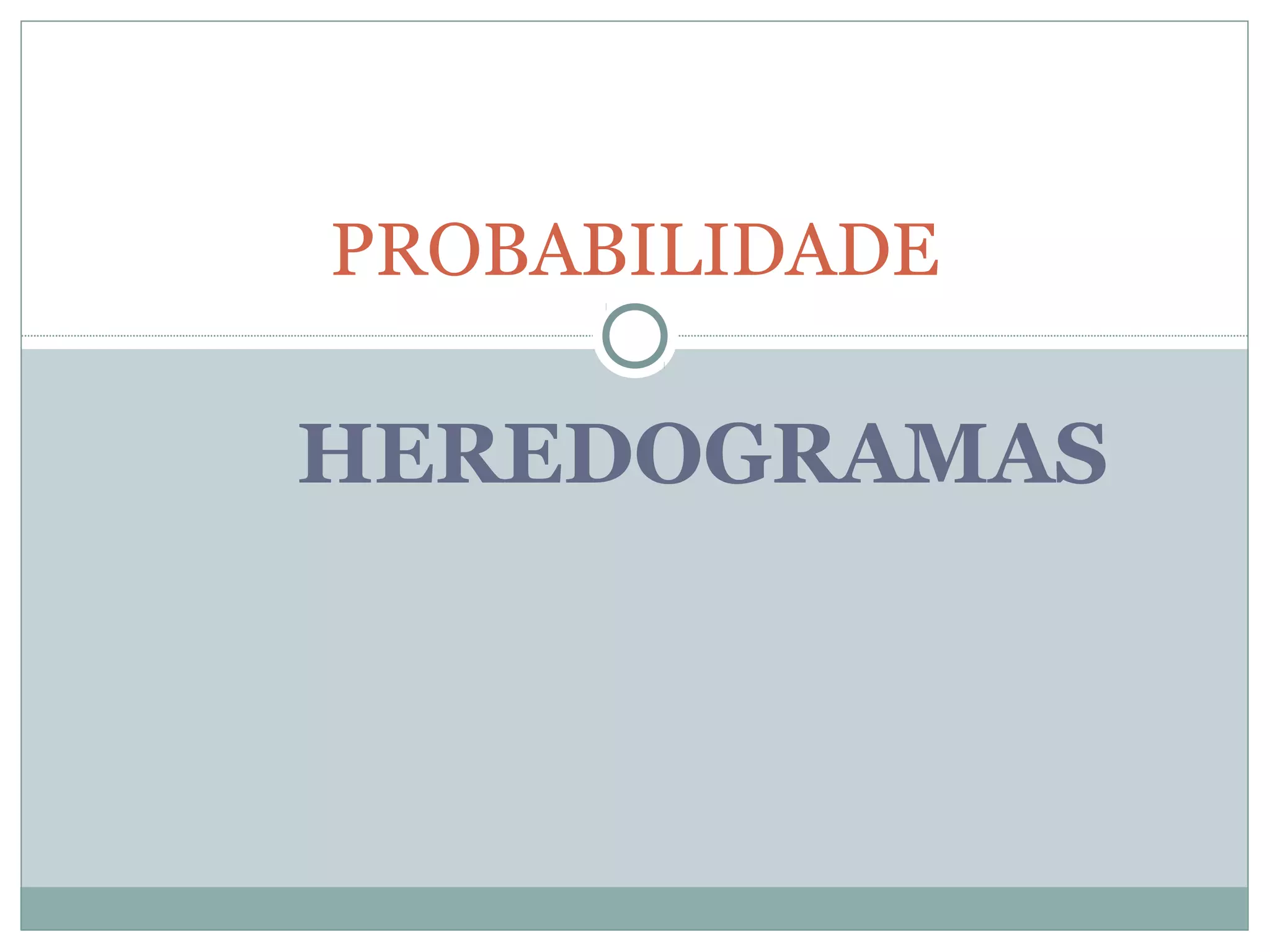 O documento discute probabilidades em genética e hereditogramas. Explica as regras do "e" e do "ou" para probabilidades, e como construir e ler hereditogramas para representar padrões de herança genética em famílias.