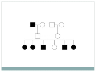 O documento discute probabilidades em genética e hereditogramas. Explica as regras do "e" e do "ou" para probabilidades, e como construir e ler hereditogramas para representar padrões de herança genética em famílias. Também cobre conceitos como genes letais, cruzamentos-teste e possíveis tipos de herança genética.