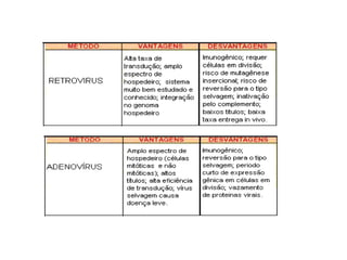 O documento discute a terapia gênica, que envolve introduzir cópias de genes em células para tratar doenças genéticas ou não genéticas. Apresenta questões bioéticas relacionadas à modificação permanente do genoma humano e possíveis danos à saúde. Também discute vetores usados para entregar genes às células-alvo e a importância de limites éticos como testes em animais e focar em doenças graves com potencial de benefício maior que o risco.