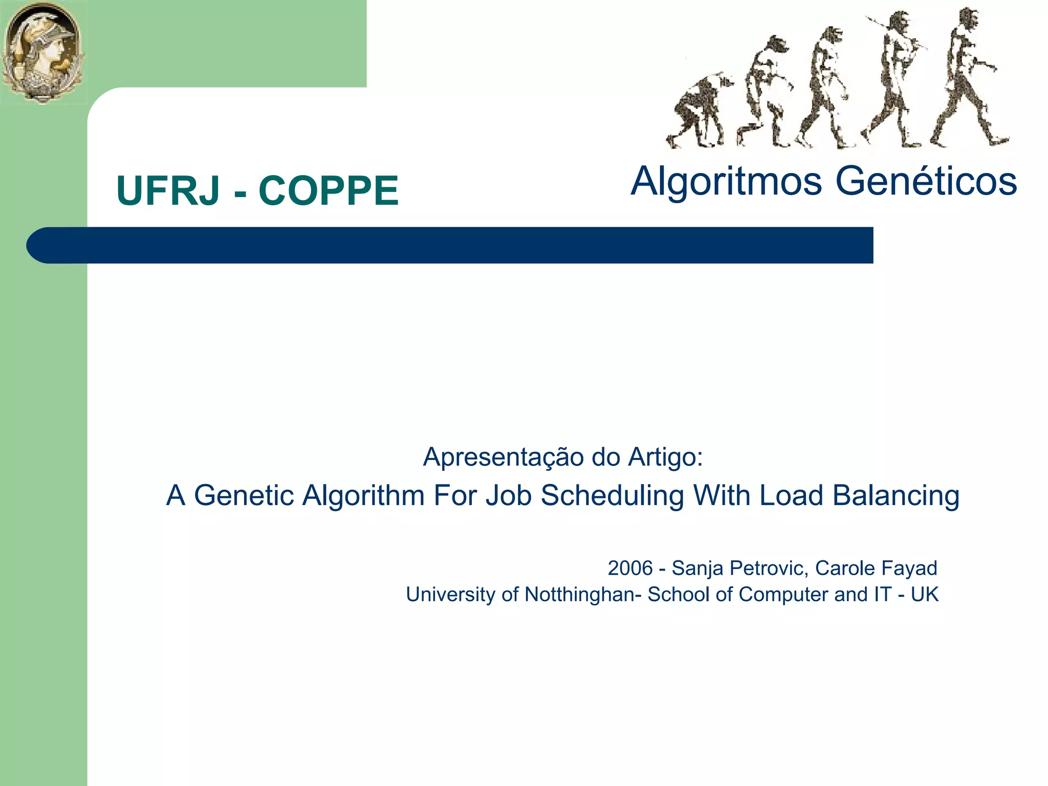 O documento descreve um algoritmo genético para balanceamento de carga em um problema de agendamento de tarefas em máquinas. O algoritmo tem como objetivo minimizar o tempo total de processamento através da alocação ótima de lotes de trabalhos em máquinas, levando em conta fatores como tempo de espera, atrasos e ociosidade das máquinas. Ele usa lógica fuzzy para determinar o tamanho dos lotes e um AG para encontrar as melhores combinações de alocação de lotes em máquinas, medindo o nível de dispersão da carga