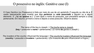(I) O documento discute as formas genitivas e plurais no inglês. Apresenta regras para a formação do caso genitivo com nomes de pessoas e coisas e exceções.