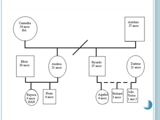 O documento fornece informações sobre genogramas familiares, definindo-o como uma técnica gráfica para representar a estrutura familiar e obter uma visão geral desta. Explica que genogramas podem conter símbolos simples como masculino e feminino ou extras como gravidez, e linhas para indicar relações como conjugal, filiação e irmãos. Demonstra exemplos de genogramas simples e complexos.