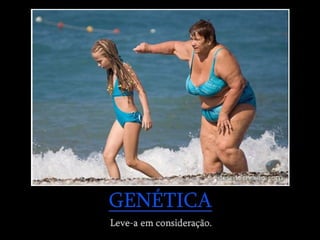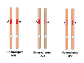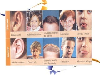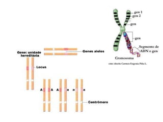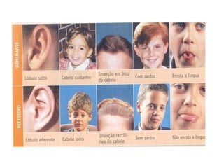 O documento resume conceitos básicos de genética, como hereditariedade, genes, cromossomos, alelos dominantes e recessivos, genótipo e fenótipo. Explica termos como locus gênico, gametas, zigoto e como a combinação dos alelos paternos e maternos determina as características hereditárias nas gerações futuras.