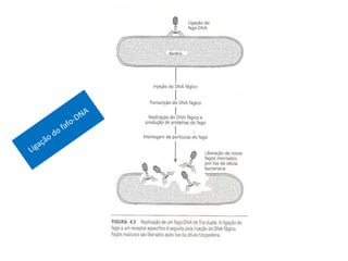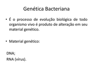 O documento discute a genética bacteriana, descrevendo que bactérias possuem DNA circular não envolto por uma membrana nuclear. Explica que o DNA bacteriano pode ser cromossômico ou extracromossômico, como plasmídeos. Também aborda mecanismos de variabilidade genética como mutação, conjugação, transdução e transformação.