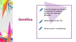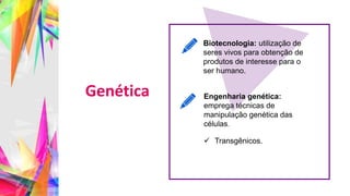 O documento fornece informações sobre ácidos nucleicos, incluindo suas características químicas, estrutura e funções. Descreve as diferenças principais entre DNA e RNA, como o DNA tem uma estrutura de dupla hélice enquanto o RNA tem uma fita simples e contém uracila em vez de timina. Também resume os papéis do RNA mensageiro, RNA transportador e RNA ribossômico na célula.