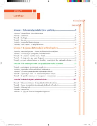 O documento apresenta informações sobre os biomas brasileiros, divididos em quatro unidades. A Unidade 1 descreve as características naturais dos principais biomas, incluindo Amazônia, Caatinga, Cerrado, Pantanal, Mata Atlântica, Zona Costeira e Campos Sulinos. As unidades subsequentes abordam a formação do território brasileiro, a ocupação atual do solo e as regiões geoeconômicas do país.