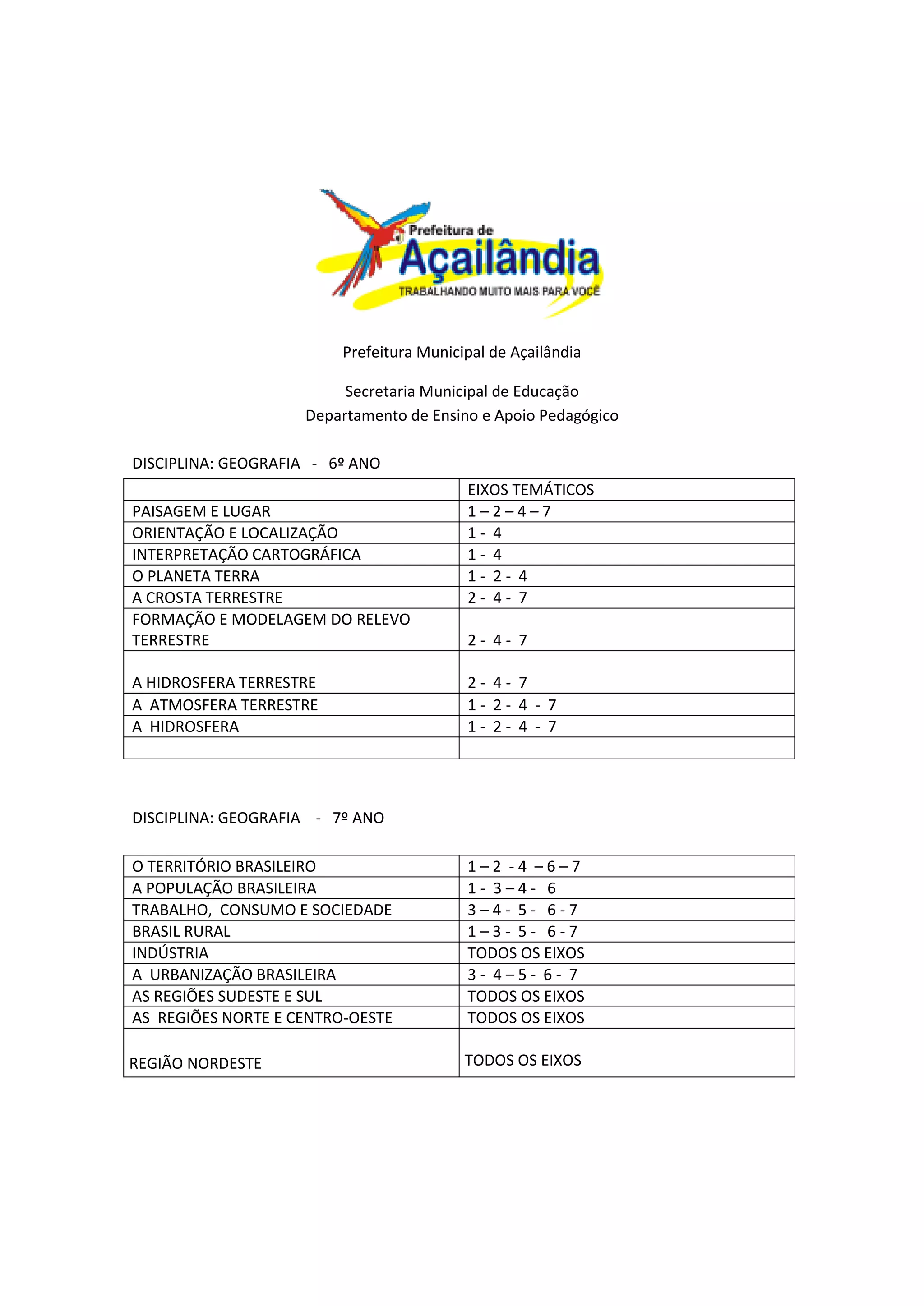 O documento lista os eixos temáticos abordados em cada ano do ensino fundamental para a disciplina de Geografia de acordo com a proposta curricular de uma secretaria municipal de educação. Os eixos variam de acordo com o ano letivo e incluem tópicos como paisagem e localização, formação do relevo terrestre, população brasileira, urbanização e regiões do Brasil e do mundo.