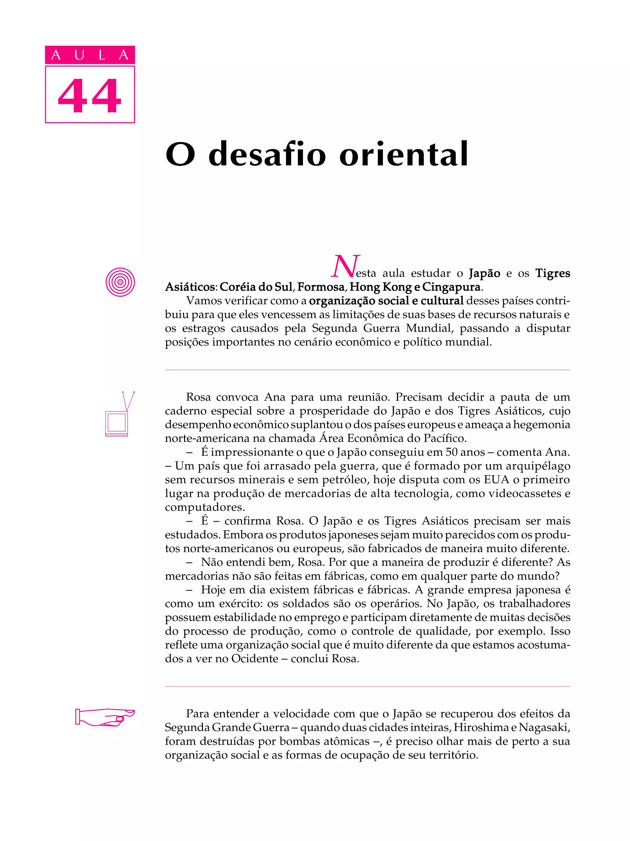 1) O documento discute o desenvolvimento econômico do Japão e dos "Tigres Asiáticos" (Coreia do Sul, Hong Kong, Taiwan e Cingapura) após a Segunda Guerra Mundial.