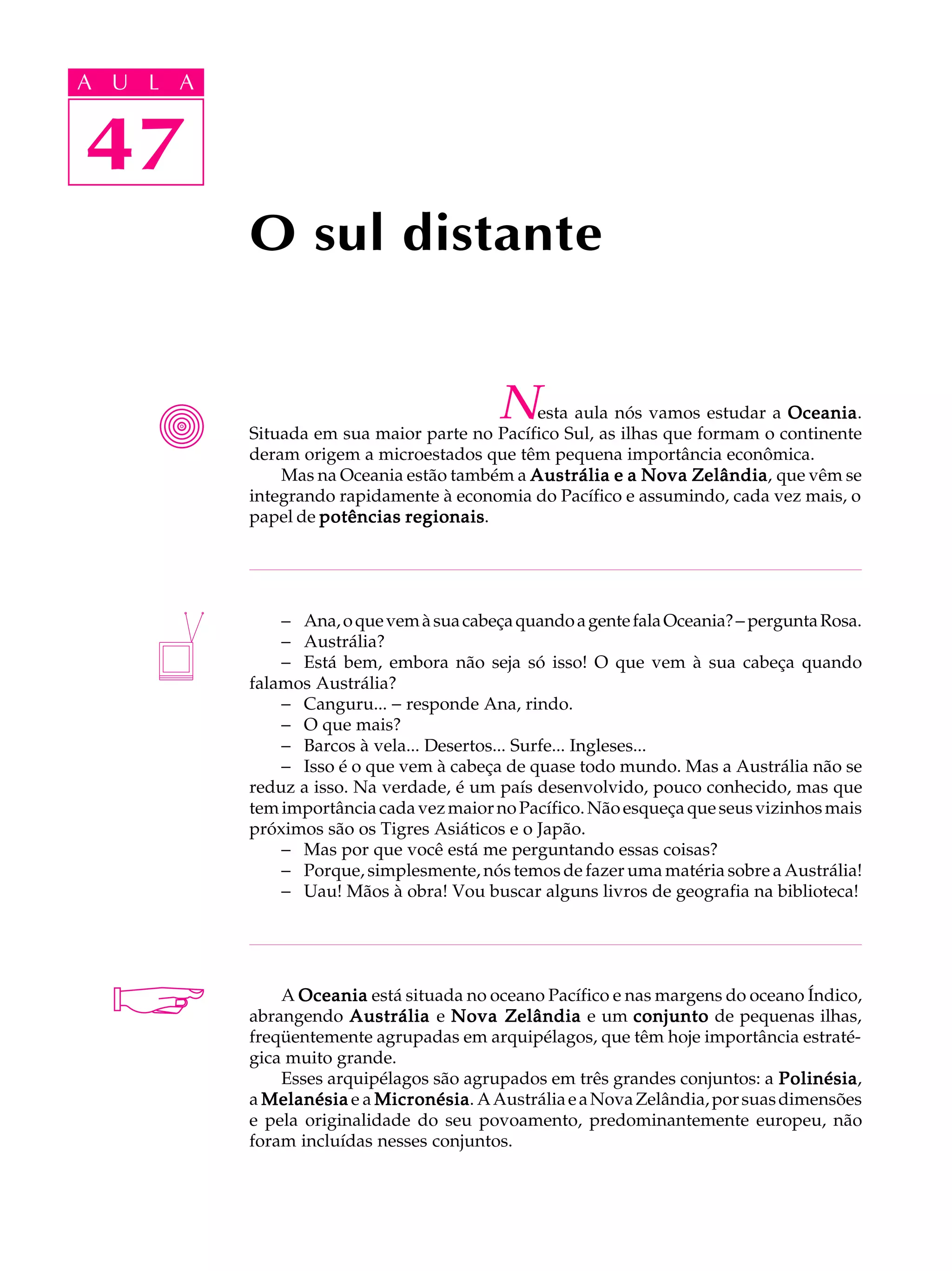 O documento apresenta informações sobre a Oceania, incluindo sua localização e os principais países e arquipélagos que a compõem, com foco na Austrália e Nova Zelândia. Descreve as características econômicas e comerciais desses dois países, seu crescente papel na economia do Pacífico e sua aproximação por meio de políticas econômicas semelhantes.