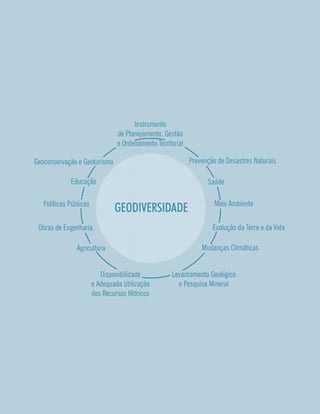 O capítulo apresenta os conceitos de geodiversidade e origem da Terra, discutindo a evolução do conceito de geodiversidade e sua aplicação no Brasil. Explica que a geodiversidade compreende a diversidade natural entre aspectos geológicos, relevo e solos, em constante dinâmica por processos naturais. Aborda também a origem e evolução da geodiversidade no território brasileiro ao longo do tempo geológico.