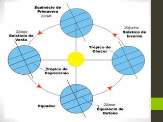 •Solstício: sol incide perpendicular a um dos trópicos.