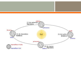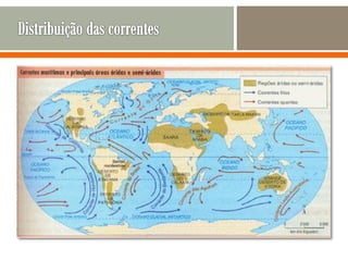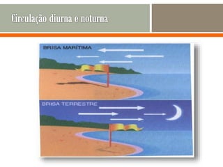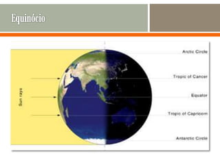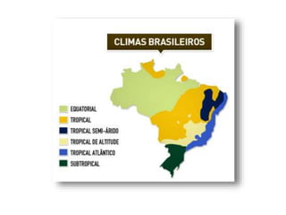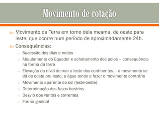O documento descreve os principais movimentos da Terra e suas consequências, incluindo a rotação sobre o eixo, que causa o dia e a noite, e a translação em torno do Sol, que causa as estações do ano. Também explica os efeitos dos ventos, correntes oceânicas e massas de ar no clima, e lista e descreve os principais tipos de clima.