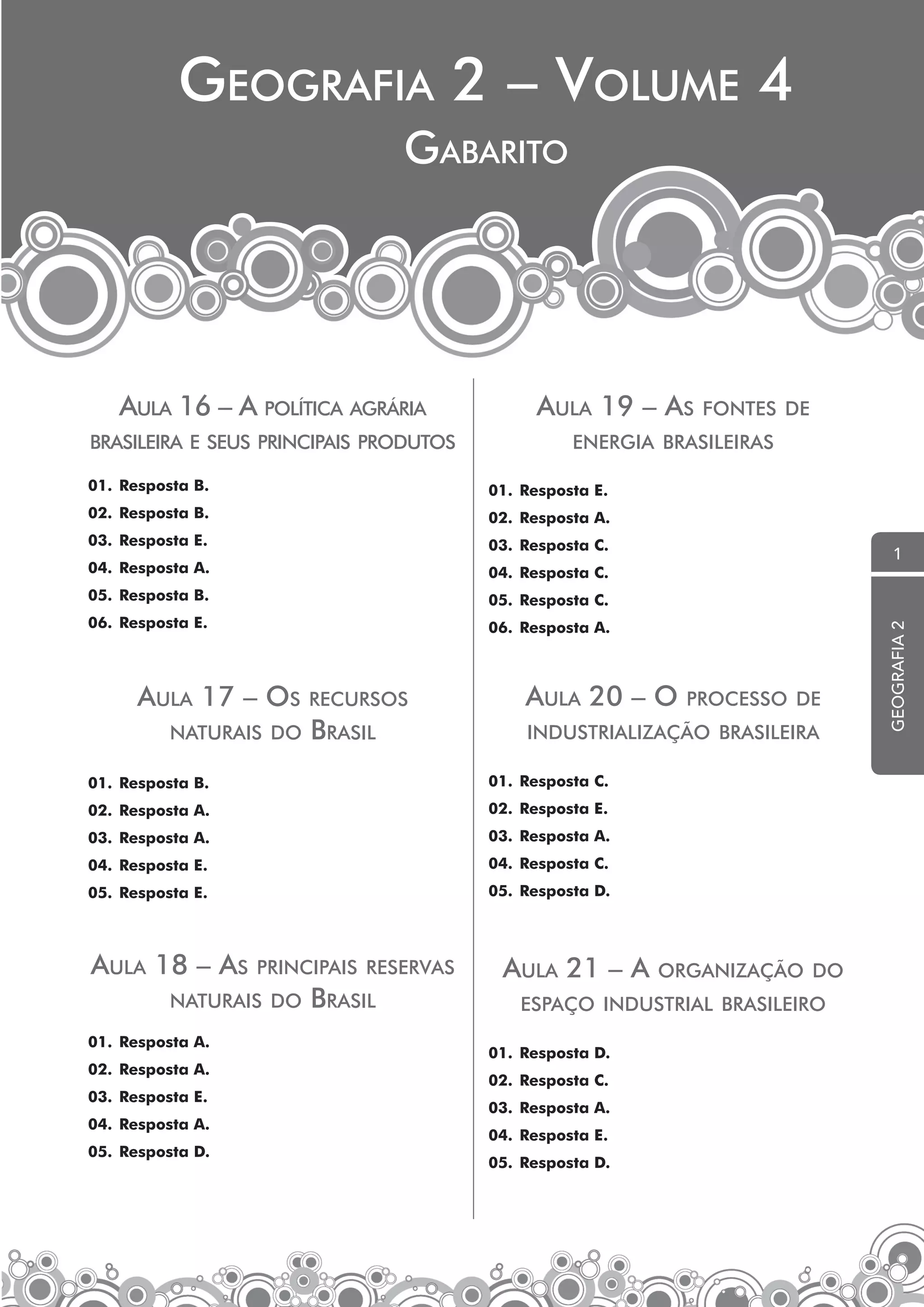 O documento contém as respostas corretas para vários exercícios de geografia sobre tópicos como a política agrária brasileira, recursos naturais, fontes de energia, industrialização e organização industrial do Brasil.