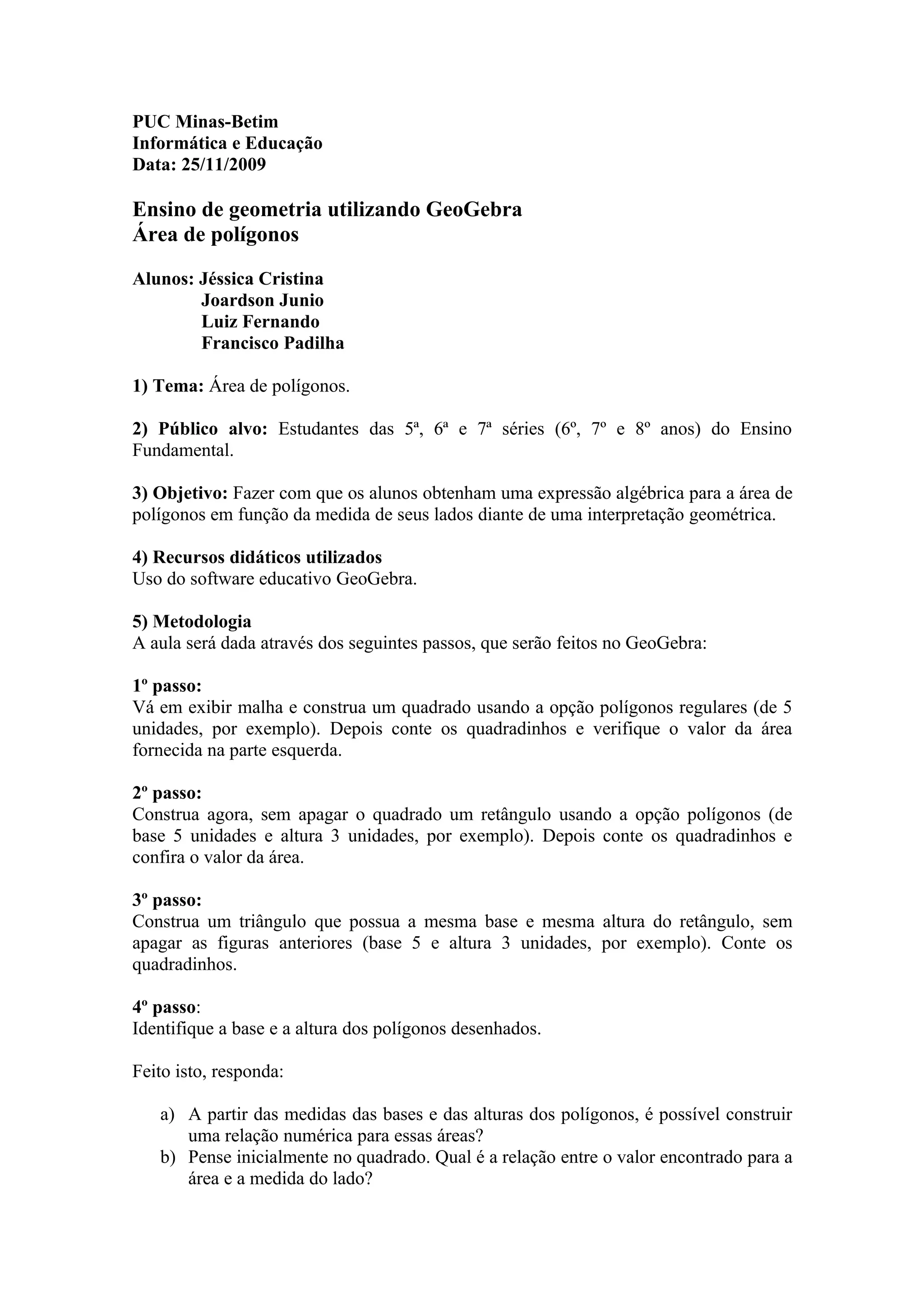 Este documento descreve uma atividade didática para ensinar áreas de polígonos para alunos de 5a a 7a série utilizando o software GeoGebra. Os alunos irão construir e medir áreas de quadrados, retângulos e triângulos para identificar as relações entre as medidas dos lados e o cálculo das áreas.