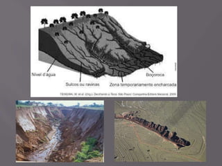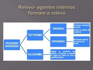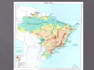 O documento discute a formação do relevo brasileiro. O relevo é antigo, formado há milhões de anos, e continua sendo esculpido por processos erosivos recentes como a ação da água, vento e temperatura. É composto majoritariamente por planícies, planaltos e depressões que foram moldados ao longo do tempo geológico.