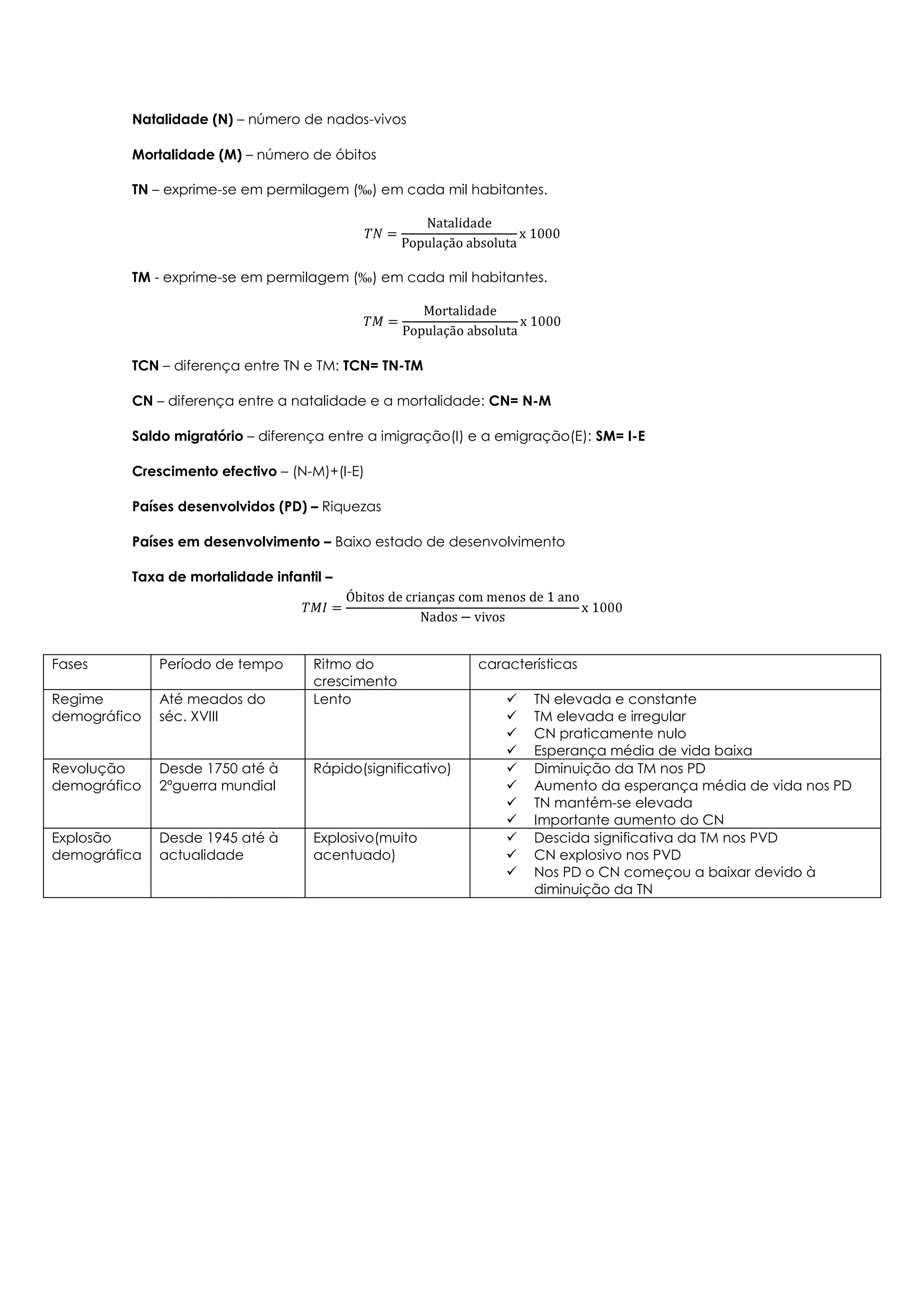 O documento define termos demográficos como natalidade, mortalidade e taxas associadas. Discute as fases do regime demográfico, revolução demográfica e explosão demográfica, caracterizadas por diferentes ritmos de crescimento populacional e mudanças nas taxas de natalidade e mortalidade entre países desenvolvidos e em desenvolvimento.