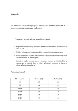 O documento fornece instruções para construir uma pirâmide etária usando dados populacionais divididos por classe etária, sexo e porcentagem. Ele lista 4 etapas para desenhar a pirâmide em papel milimétrico com eixos dividindo os dados por sexo à esquerda para homens e à direita para mulheres. Uma tabela fornece os dados populacionais por classe etária de 0 a mais de 75 anos.