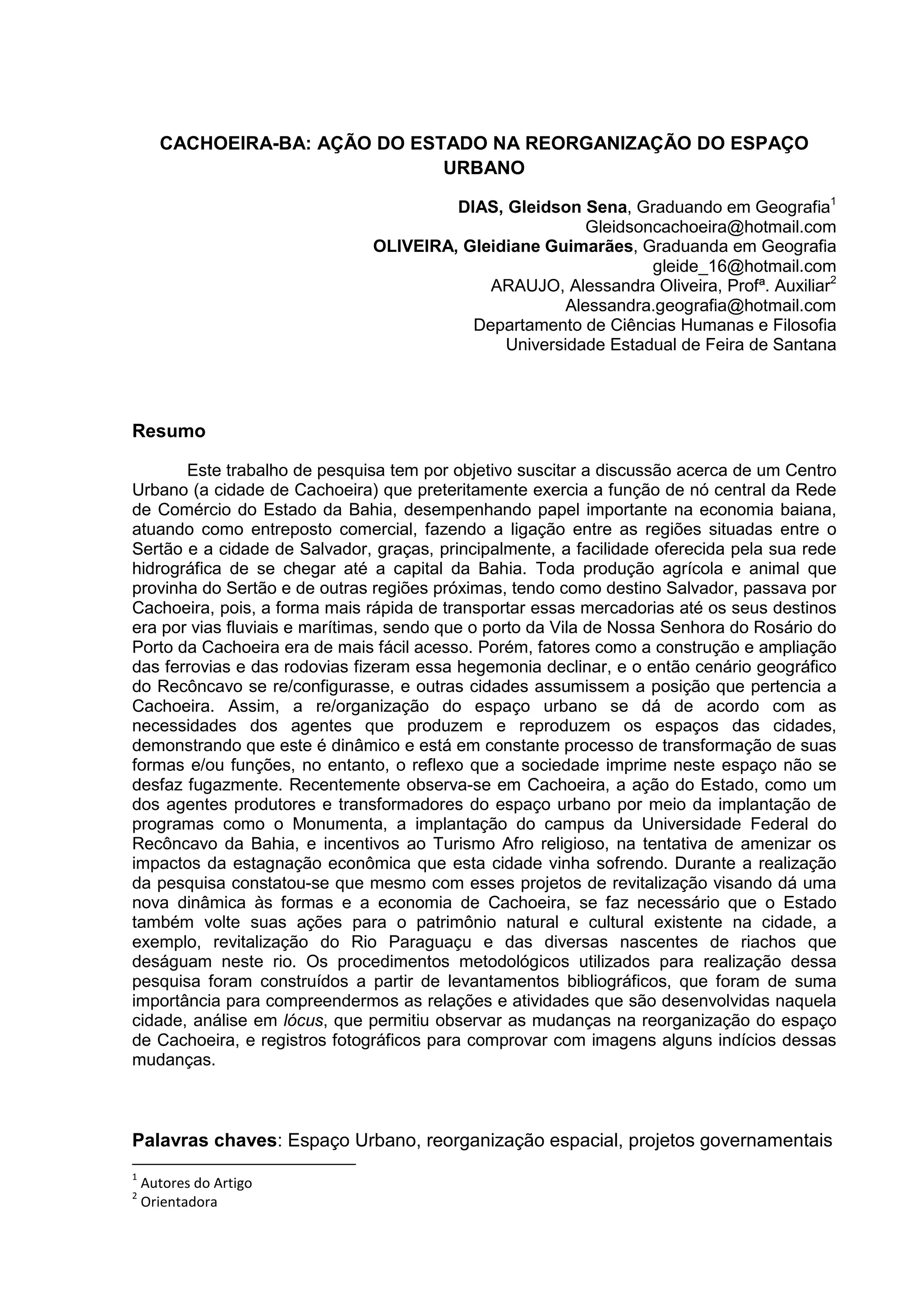 Este documento discute a reorganização do espaço urbano da cidade de Cachoeira, Bahia, Brasil. A cidade outrora exercia um papel importante como entreposto comercial, mas entrou em declínio com a construção de ferrovias e rodovias. Recentemente, o Estado tem implementado projetos como o Programa Monumenta, a Universidade Federal do Recôncavo da Bahia e incentivos ao turismo afro-religioso para revitalizar a economia da cidade. No entanto, mais esforços são necessários para preservar o patrim