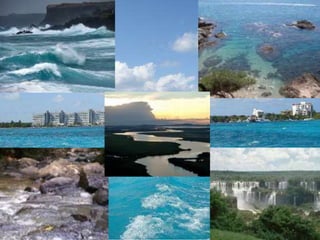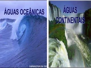 O documento descreve as diferentes formas de água no planeta. A maior parte da superfície da Terra, cerca de 361 milhões de km2, é coberta por águas oceânicas que formam os oceanos e mares. As águas continentais, como geleiras, rios e lagos, são também importantes para a vida e o transporte. O documento fornece exemplos de como as águas continentais, especialmente os rios, apoiam a agricultura, o transporte e o ecossistema.