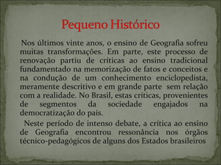 O documento discute as transformações no ensino de Geografia nas últimas décadas no Brasil, passando de um ensino baseado na memorização para um mais crítico e contextualizado. Também aborda a importância de conceitos como território, paisagem e lugar, e de desenvolver habilidades como leitura de mapas.