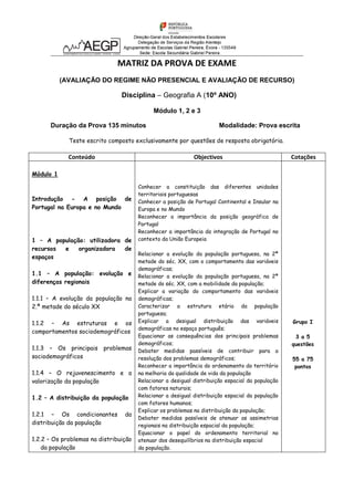 Este documento fornece informações sobre a prova de Geografia A do 10o ano, cobrindo os Módulos 1, 2 e 3. A prova terá 135 minutos e será composta por questões de resposta obrigatória sobre os seguintes tópicos: 1) população e distribuição geográfica em Portugal, 2) recursos naturais como o mar, subsolo e sol, e 3) recursos hídricos. A pontuação total será de 200 pontos distribuídos em 3 grupos de questões.