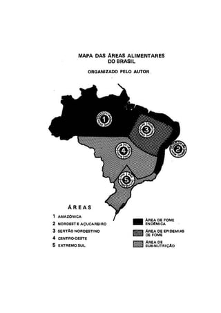 1) O livro analisa as causas e consequências da fome no Brasil, discutindo os dilemas entre desenvolvimento agrícola e industrialização.