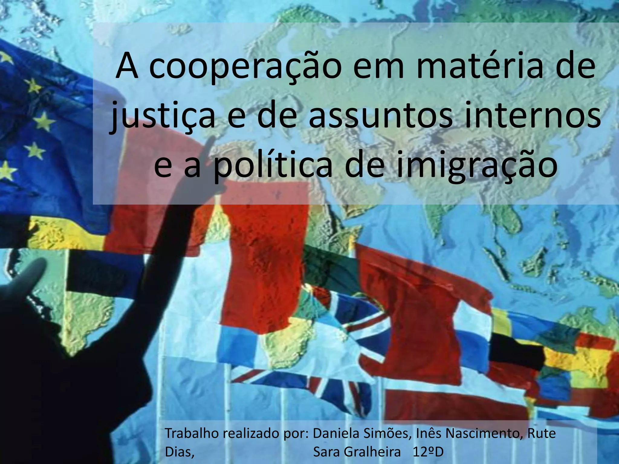 O documento discute a cooperação em matéria de justiça e assuntos internos na União Europeia, incluindo o Acordo de Schengen que elimina fronteiras internas e harmoniza políticas de imigração e asilo. Também aborda desafios como a pressão migratória na Europa e o combate à criminalidade através de sistemas como o SIS e a agência Europol.