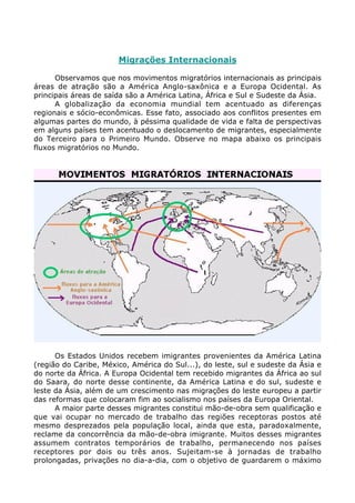 O documento discute os movimentos migratórios, definindo termos como migração, emigração e imigração. As principais causas de migração são econômicas, como a busca por melhores empregos e salários, e de repulsão, como secas. Historicamente, o Nordeste do Brasil tem sido a principal região de emigração devido à pobreza e falta de oportunidades.