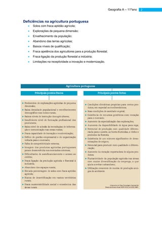 Este documento discute a agricultura em Portugal. Apresenta as principais características da população agrícola portuguesa, incluindo a diminuição da mão-de-obra agrícola devido à mecanização e êxodo rural. Também discute os problemas estruturais da agricultura portuguesa como a dependência externa, baixos níveis de rendimento e má utilização da terra. Finalmente, examina o impacto da Política Agrícola Comum da União Europeia na agricultura portuguesa.