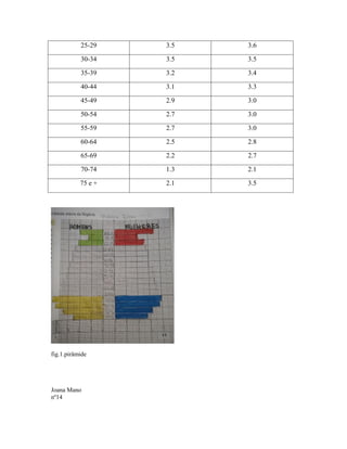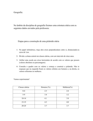 O documento fornece instruções em 4 etapas para construir uma pirâmide etária usando dados sobre a distribuição populacional por idade e sexo. Os dados incluem as porcentagens de homens e mulheres em diferentes classes etárias de 0 a mais de 75 anos.