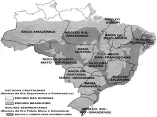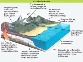 O documento apresenta uma introdução à geologia, definindo-a como a ciência que estuda a constituição e evolução física da Terra. Discorre sobre a idade da Terra, entre 4,5 e 5 bilhões de anos, e sobre como os geólogos determinam essa idade através da radioatividade. Também aborda a estrutura interna da Terra e os principais agentes que moldam seu relevo, tanto internos como vulcanismo e terremotos, quanto externos como rios, geleiras e mar.