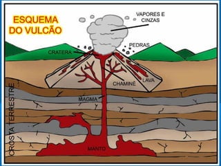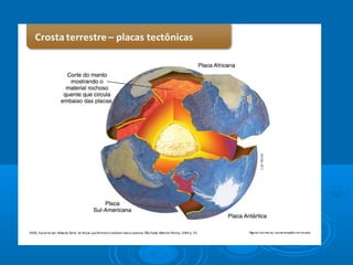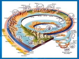 O documento descreve a estrutura geológica da Terra, incluindo sua formação, composição interna, placas tectônicas e movimentos. Ele também explica os processos geológicos como vulcanismo, terremotos e deriva continental, além de apresentar a escala geológica de tempo.