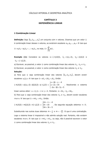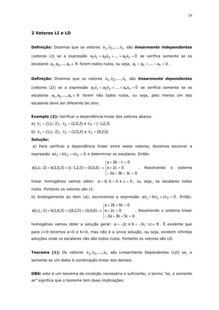 O documento discute conceitos fundamentais de dependência linear e bases de vetores. Ele define combinação linear, vetores linearmente independentes (LI) e dependentes (LD), e apresenta teoremas relacionados a essas noções. O documento também discute o que é uma base de vetores e apresenta exemplos de bases nos espaços R2 e R3.