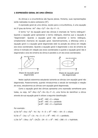 O documento discute as seções cônicas, curvas planas obtidas da interseção de um plano com um cone de revolução. Apresenta breve histórico sobre o estudo destas curvas desde a Grécia Antiga, destacando contribuições de Arquimedes, Apolônio, Galileu e Newton. Em seguida, define e apresenta as equações das principais seções cônicas: elipse, hipérbole, parábola e circunferência.
