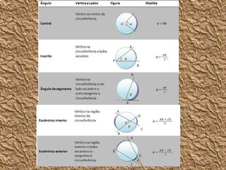 O documento descreve as propriedades geométricas básicas da circunferência e do círculo, incluindo raio, diâmetro, corda, ângulos centrais, inscritos e excêntricos. Também discute simetrias na circunferência, polígonos inscritos e as fórmulas para área e perímetro do círculo.