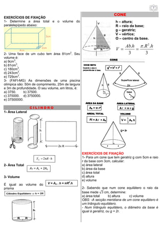 1. O documento apresenta conceitos e fórmulas de geometria espacial relacionados a sólidos como prisma, paralelepípedo, cubo, cilindro, cone, pirâmide e esfera.