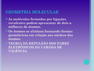 1. A geometria molecular descreve as formas geométricas que as moléculas assumem de acordo com a disposição dos átomos.
