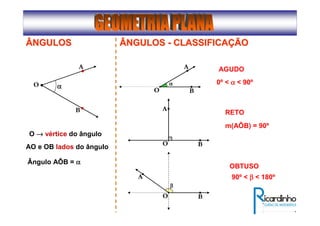 1) O documento descreve conceitos básicos de ângulos e classificação de ângulos;