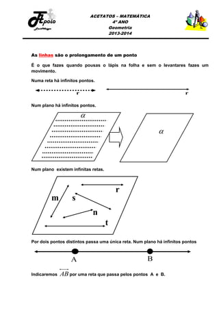 Este documento apresenta os conceitos fundamentais de geometria para o 4o ano, incluindo definições de ponto, reta, plano, ângulo, polígonos e suas propriedades.