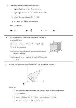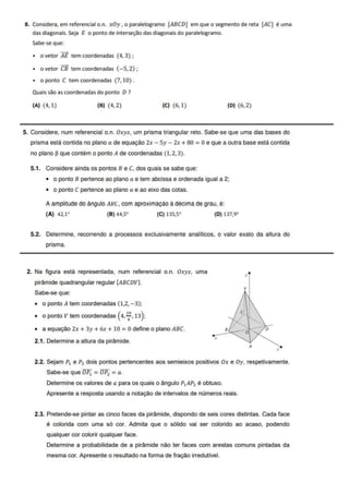 1. O documento apresenta vários exercícios de geometria analítica no espaço envolvendo planos, retas e figuras geométricas como prisma, pirâmide e cone.