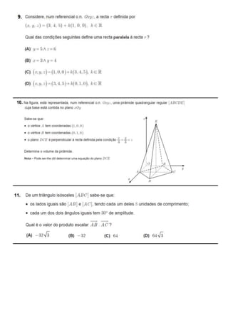 2. São solicitadas determinações de equações de planos e retas, cálculo de ângulos, volumes de figuras geométricas e verificações de pertencimento de pontos a planos e incidências de retas e planos.