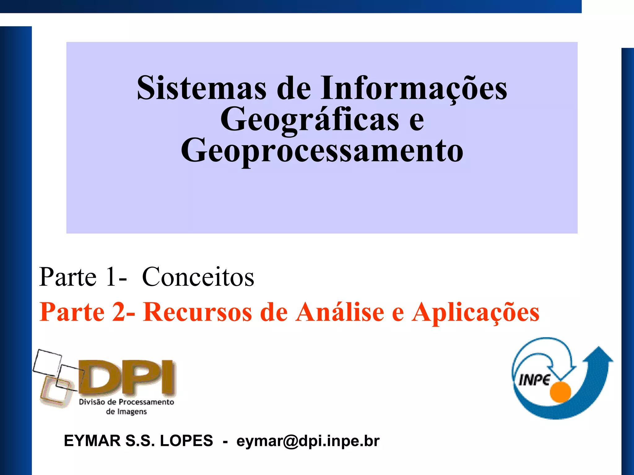 O documento discute aplicações de sistemas de informações geográficas (SIG) e geoprocessamento, incluindo consultas a bancos de dados geográficos, álgebra de mapas e inferência geográfica. É apresentado o uso de imagens de satélite para detectar uma mancha de óleo na Baía de Guanabara no Rio de Janeiro através de análise multiespectral e segmentação de imagens.