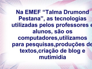 Na EMEF "Talma Drumond Pestana", os professores e alunos usam computadores para pesquisas, produção de textos, criação de blogs e multimídia. Isso demonstra a importância das tecnologias para uma educação mais inovadora e que auxilia na aprendizagem. As aulas devem ser bem planejadas com objetivos que garantam que todos os alunos façam uso das tecnologias.