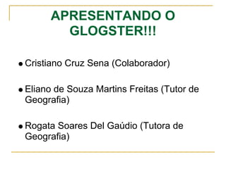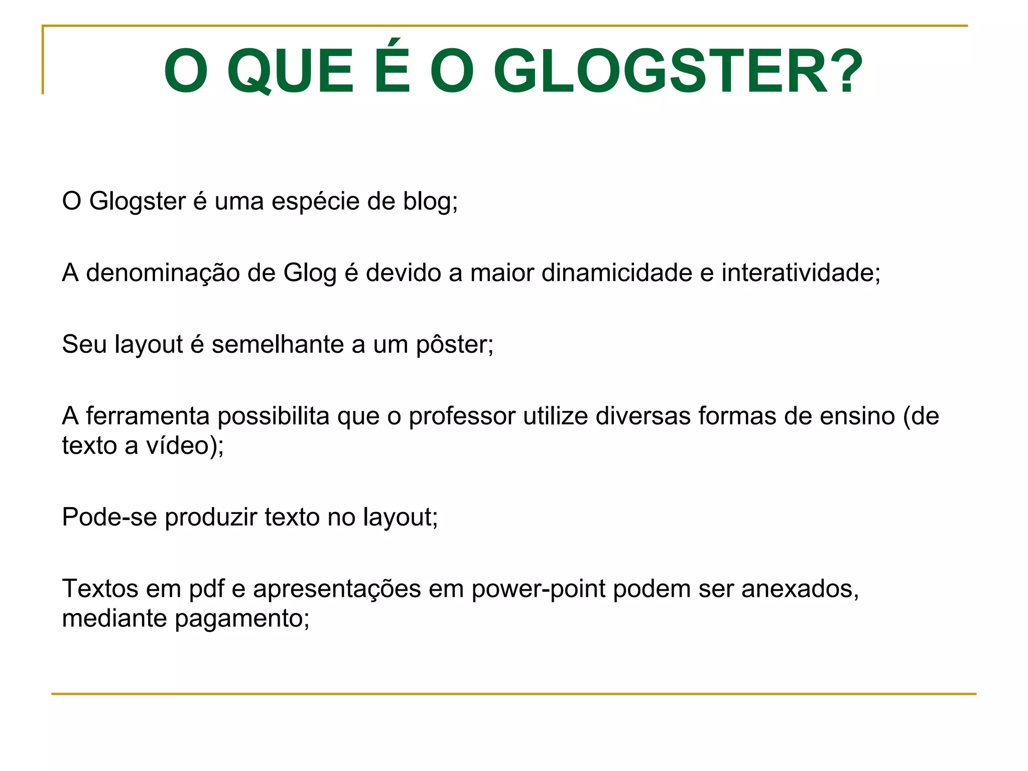 O documento apresenta o Glogster, uma ferramenta online que permite criar pôsteres interativos. Explica que o Glogster oferece diversas ferramentas gráficas, de texto, áudio e vídeo para decorar e personalizar os pôsteres. Inclui exemplos de como usar as ferramentas gráficas e caixas de texto para ilustrar o pôster.