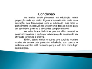 O documento discute o uso de vídeos, CDs e DVDs na educação. Ele explica como esses meios podem ser usados para sensibilização, ilustração e autoanálise e como melhoram a assimilação de conteúdo pelos alunos. Também descreve como as mídias tornam o aprendizado mais dinâmico e criativo ao permitir ver, ouvir e participar ativamente.
