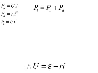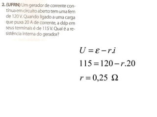O documento discute geradores e receptores elétricos. Explica que geradores transformam energia em energia elétrica através da força eletromotriz, enquanto receptores fazem o oposto. Detalha as equações que descrevem o funcionamento de geradores e receptores, incluindo a força eletromotriz, resistência e corrente. Também aborda conceitos como rendimento, gráficos de tensão versus corrente e exercícios de aplicação destes conceitos.