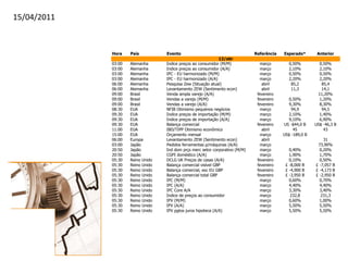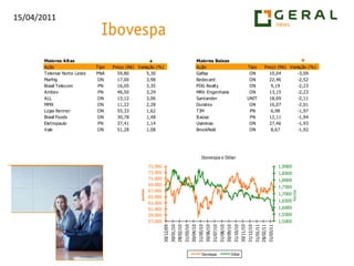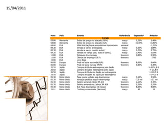 Índices de bolsade valores:O Ibovespa fechou em baixa na quinta-feira. O índice encerrou o dia com variação de -0,31%. As ações da Telemar Norte Leste foram os destaques de alta (5,30%) no índice. Já o de baixa, ficou por conta dos papéis Gafisa (-3,09%).Moedas:O dólar teve desvalorização frente ao real, variando -0,14% no dia. A taxa de câmbio fechou cotada a R$/US$ 1,5842.Mercado Financeiro, risco e commodities:A taxa de juros referencial DIxPré 1 ano caiu 0,33p.p., passando para 12,25% a.a. O preço por barril tipo WTI teve alta de 0,93% nos negócios de ontem, fechando cotado a US$/barril 108,11. O índice VIX, o chamado indicador do medo, caiu 3,84% no último pregão, registrando 16,27 pontos.Principais eventos econômicosBrasil:A agenda de hoje divulgará o IGP-10 (abr) da FGV.Estados Unidos e Europa:Nos Estados Unidos, destaque para: o índice Empire Manufacturing de atividade (abr); o fluxo de capitais estrangeiros (fev); a produção industrial (mar); a utilização da capacidade instalada (mar); e o índice de confiança da Universidade de Michigan (abr). Na Europa, serão divulgados o índice de preços ao consumidor (mar) e a balança comercial (fev) da Zona do Euro.