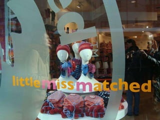 O documento descreve as características da Geração Y, nascidos entre 1980-1994. Eles terão maior poder aquisitivo do que seus pais e influenciam suas famílias e sociedade. São orientados à tecnologia, pesquisam muito online, gostam de personalização e reconhecimento. A loja Little Miss Matched atende bem a este público com sua variedade de produtos coloridos e conceito de permitir a expressão das crianças.